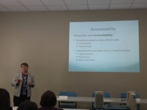 Our day began with a board governance primer from Linnea Michel – a 2010 LSC alumna and President of the Legal Center for Nonprofits. Linnea provided a few statistics on the nonprofit sector in our region. Did you know that Bristol County is home over 2,000 nonprofit organizations?! She also briefed the class on board service and what boards need to be successful.